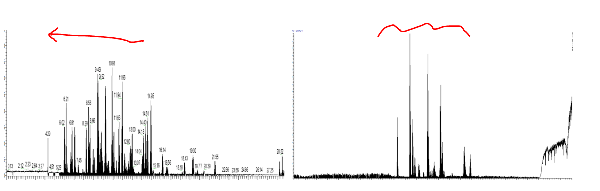 아래는 점검이 필요한 크로마토그램의 예입니다. 아래 왼쪽의 크로마토그램의 경우는 전반적으로 피크들이 왼쪽으로 편향되어 있습니다. 각각의 피크모양은 위에 크로마토그래피에서는 약간 넓은 편이지만 전반적으로는 괜찮습니다. 하지만 약간 왼쪽으로 편향되어 있기에 LC 시스템에서 gradient조건을 조정해야 할 필요가 있습니다. 피크 모양도 조금더 좋아지면 좋을듯합니다. 오른쪽은 몇개의 피크들만 보입니다. 이 경우에는 컬럼과 LC에 문제가 있음을 알 수 있습니다.
