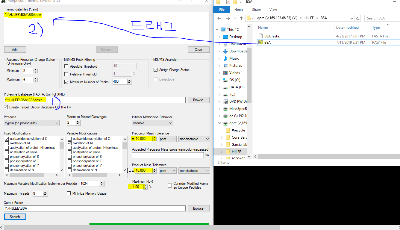 다른 글에서 이야기 했듯이 대부분 실험실에서 분석을 시작하기 전에 Standard mixture (e.g, BSA)로 장비상태를 확인합니다. 이때 데이타베이스 검색프로그램을 이용합니다. 하지만 데이타베이스용 컴퓨터는 장비 운용 컴퓨터와 분리되어 있거나 다른 사람들과 공용으로 사용합니다. 그래서 데이타 생성후 바로 검색하기가 어려울때가 있습니다. 매번 파일을 옮기는것도 귀찮습니다. 이때 장비용 컴퓨터에 설치하여 바로 검색할 수 있는 적은용량의 툴이 있으면 좋겠다고 생각했습니다.