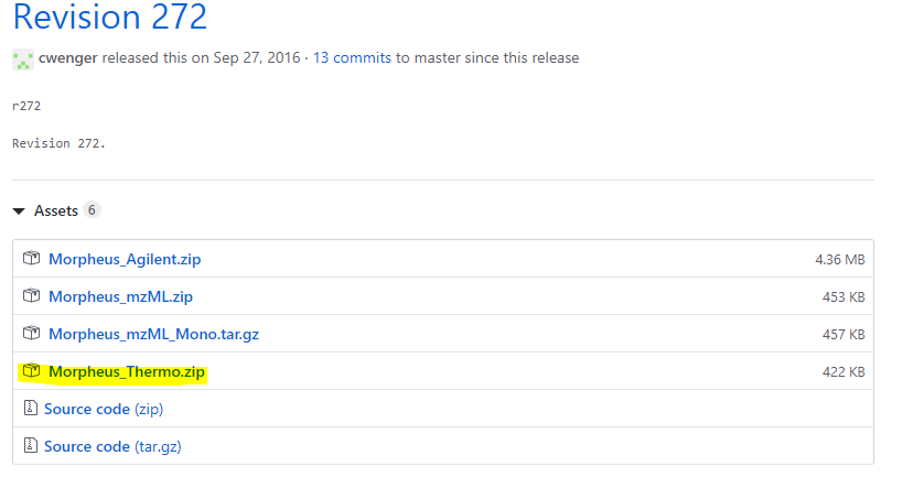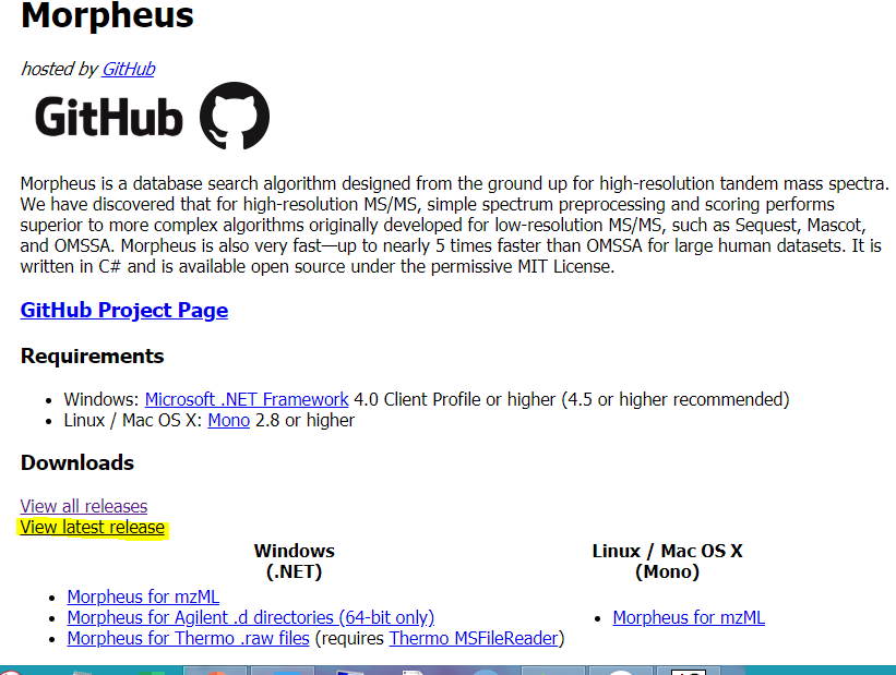 Morpheus 는 적은 용량의 프로그램이라 실험장비에 설치해도 장비운영에 아무런 영향을 주지 않습니다. BSA raw 파일을 드래그후 검색하는데 30초도 걸리지 않습니다. 이론상으로 대용량 파일도 가능한것 같습니다. 하지만 대용량의 파일은 검색 전용 컴퓨터에서 여유롭게 검색하는게 좋습니다. Morpheus 프로그램은 여러군데에서 다운로드 할 수 있습니다. 예를 들면 https://cwenger.github.io/Morpheus/ 에서 다운로드 할수 있습니다. 최신버전을 위해서 아래그럼에서와 같이 노란색 부분을 클릭합니다.