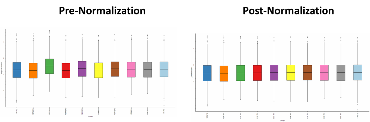 Label-free 나 TMT 같은 정량분석후 변화하는 단백질의 양을 검출하기 위해서는 최초에 얻어진 값들을 normalization하는 과정이 꼭 들어갑니다. 그렇지 않으면 시료 전처리과정이나 질량분석과정에서 발생되는 오차로 인해 생기는 단백질 양의 변화를 실제 변화라고 착각하기 쉽니다. 다행히 대부분의 프로그램은 Normalization 을 수행한후 결과값이 나오기 때문에 특별히 추가로 할일은 없습니다. 예를 들면 10-Plex TMT를 이용하여 실험한후 Proteome Discover로 분석하게 되면 모든 Channel에 대해 Normalization이 됩니다. 아래는 10-Plext TMT 실험후 Normalization 이전과 이후의 Boxplot 그래프입니다.