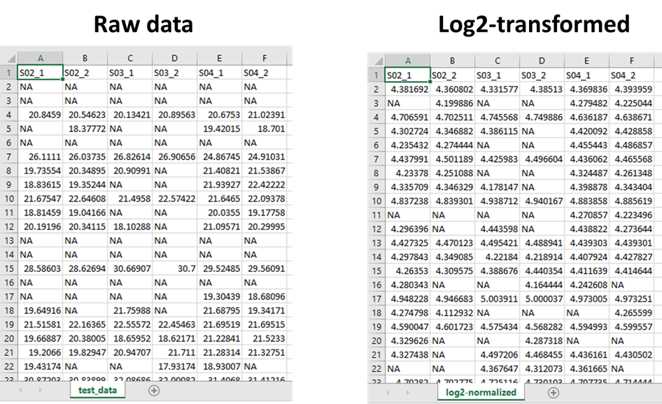 예를 들어 log2 로 normalization 파일을 열어 원본 파일과 비교하면 수치가 바뀌어있는 것을 볼수 있습니다.