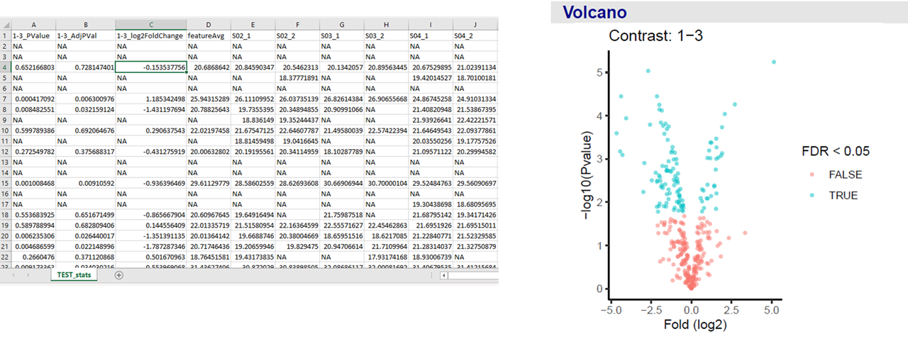 Comparison의 경우 실험 condition 수가 3개임으로 1-3으로 기입합니다. 동일하게 Start run in new tab 을 클릭하면 진행후 결과 파일을 다운로드할수 있습니다. 압축을 푼후 PDF 파일을 열면 PCA, Volcano plot등을 볼수 있습니다. 또한 TSV 파일을 열면 통계처리된 값을 볼수 있습니다.
