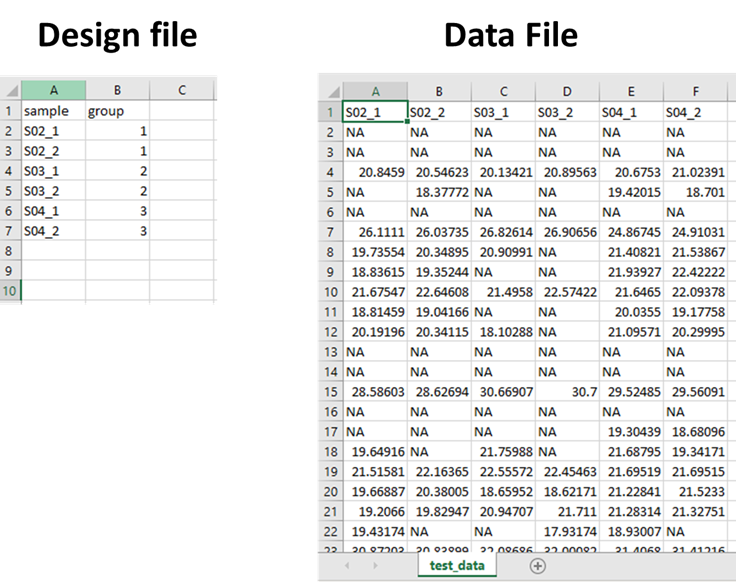웹페이지에 있는 연습용 파일 로 테스트 해보겠습니다. 일단 이 프로그램을 사용하기 위해서는 두 가지 파일이 필요합니다. 연습용 파일은 확장가가 TSV 입니다. 실험디자인에 대한 파일 하나와 실제 데이타 파일입니다. 실험디자인에 대한 파일에는 시료에 대한 정보값이 있어야 되며 여기서 사용된 파일이름과 실제 데이타 파일의 컬럼이름과 동일해야 합니다. 실험디자인 파일을 토대로 전체 시료수, Replication 수를 인식해야 실제 데이타에서 정보를 얻을 수 있습니다.