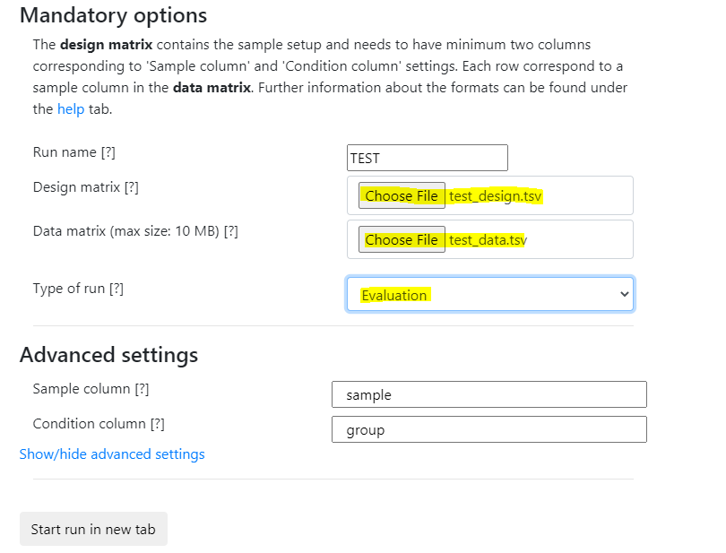 - Type of run 에는 Evaluation, Differential Expression, Both가 있습니다. 일단 Evaluation으로 해보겠습니다.