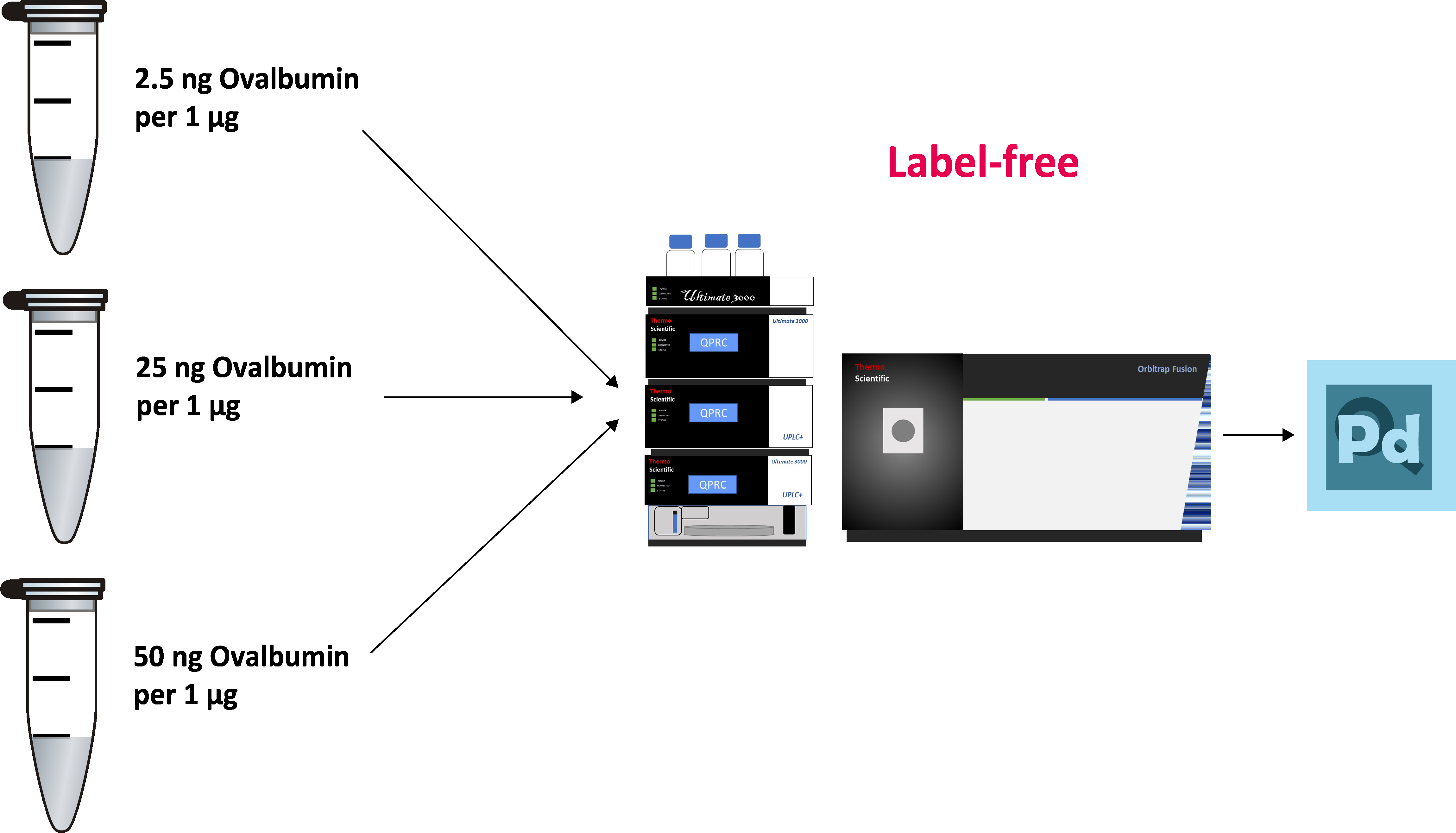 TMT와는 다르게 Cofragmentation의 영향을 받지 않는 Label-free 분석과 비교해보았다. 이를 위해 3개의 동일 양의 HeLa digestion에 Ovalbumin을 1:10:20의 비율로 첨가하여 분석하였다 (아래그림 참조)
