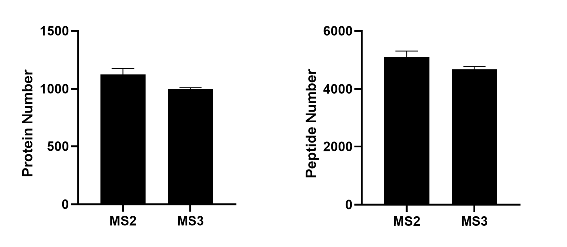 아래 그래프는 MS2 와 MS3에서 검출된 단백질(왼쪽)과 펩타이드(오른쪽)의 수를 보여줍니다. 기존에 생각했던것 과는 다르게 MS3 방법에서 얻어진 수가 MS2에서 얻어진 수에 근접하였습니다.