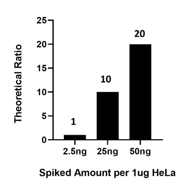 두 방법에서 측정된 Ovalbumin(이론값 1:10:20)의 상대적인 비율입니다. 아래 그래프에서 보듯이 MS2 방법에서는 이론적인 비율에 훨씬 못미치는 값을 보였지만 SPS MS3 방법에서는 이론적인 비율에 근접하는 값을 보였습니다.