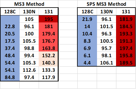 이번 테스트에서 SPS MS3 방법이 MS2에 비해서 정량성이 훨씬 높다는 것과 검출되는 단백질/펩타이드의 수도 크게 차이가 나지 않는다는 사실을 발견했습니다. 사실 유사한 실험은 오래전에도 했었으나 그 당시에는 SPS MS3방법에서 서 검출된 단백질/펩타이드의 수가 현저이 낮았었습니다. 최근 결과와 어떤점이 차이가 나는지 잘모르겠으나 아마 장비의 MS3의 감도의 차이가 아닌가 생각합니다. 최근에 엔지니어가 장비를 점검한후 감도가 향상되었었습니다. 아마 좋은 감도로 인해 MS3부분이 많이 향상되었을 것이라 생각합니다.