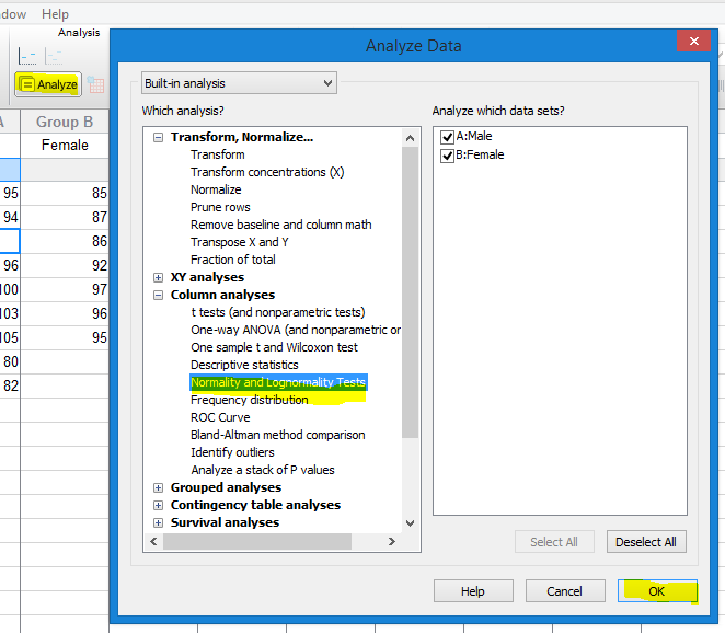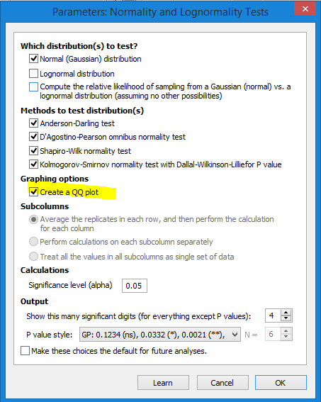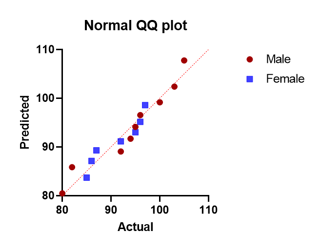 정규성 가정(Normality assumption) 을 측정하는 또 다른 방법: Q-Q plot (Quantile-Quantile Plot)를 통해 확인 할 수 있 수 있습니다. GraphPad Prism 프로그램에서는 아래와 같은 순서로 간단히 그래프를 만들 수 있습니다.