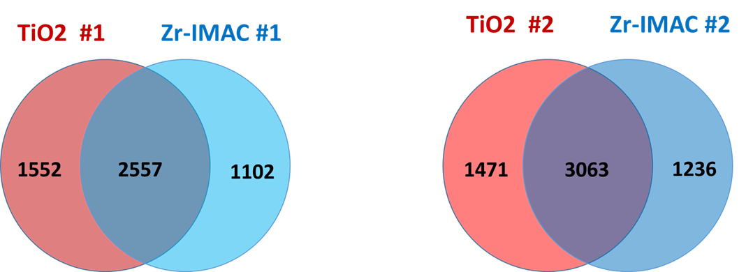 각각의 beads에서 검출된 Phosphopeptides의 수에 대한 벤다이어그램입니다. TiO2 beads에서 약간 더 많이 검출되었지만 전반적으로 크게 차이가 나지 않습니다. 하지만 검출된 상당히 많은 수의 phosphopeptides가 각각의 방법에서 검출되었습니다. Chemistry가 다르기 때문에 회수되는 펩타이드의 종류도 차이가 나는것 같습니다. 즉 한종류의 beads 보다는 서로다른 형태의 beads를 동시에 사용하며 검출되는 펩타이드의 수를 증가시킬수 있습니다.