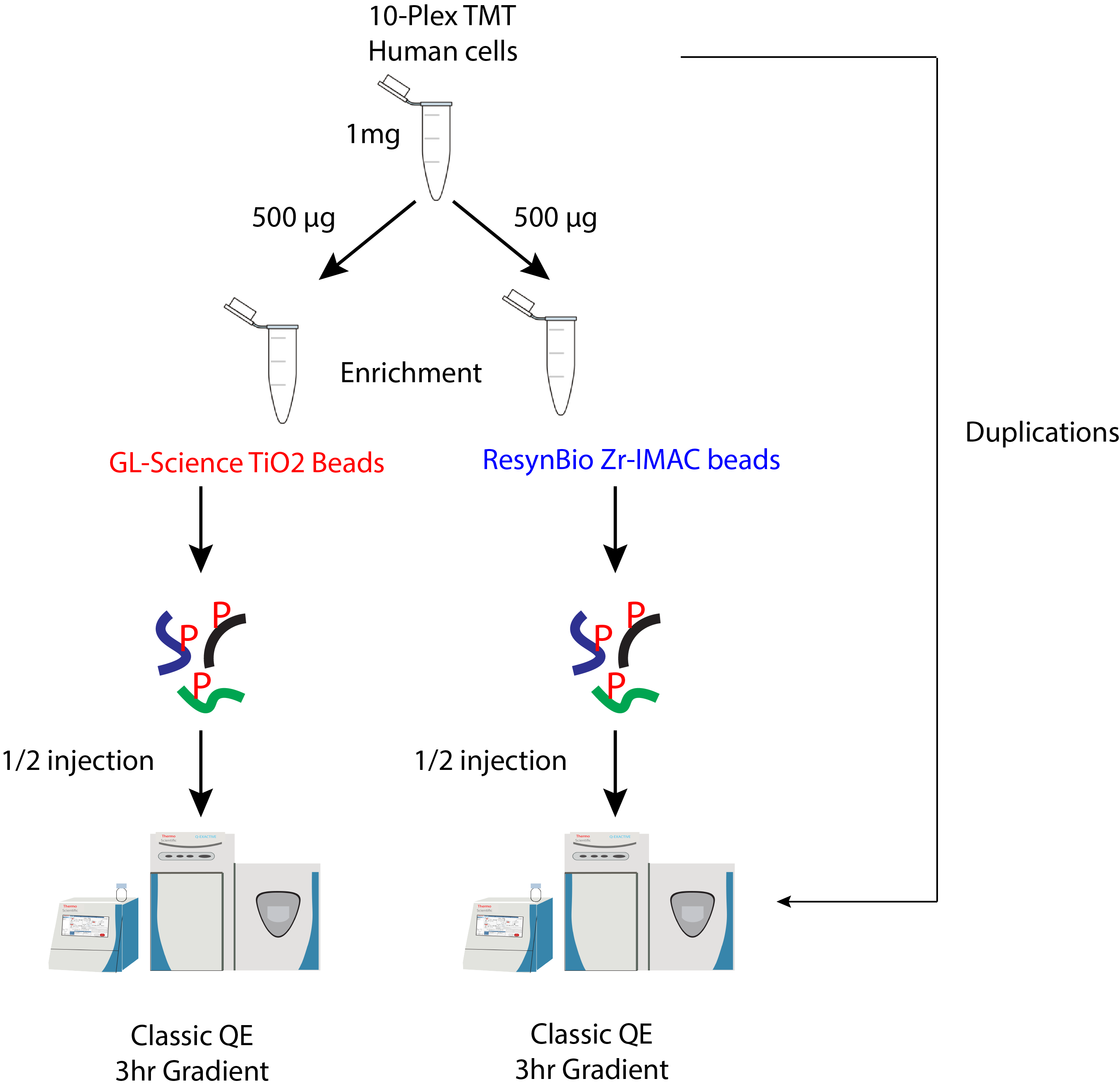그림과 같이 10-Plex TMT가 결합된 human cell 1mg을 절반으로 나누어서 각각의 beads에 적용한후 최종 회수된 시료의 절반을 classic QE로 분석하였습니다. 그리고 동일한 방법으로 처음부터 반복수행하였습니다.