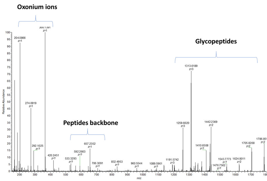 먼저 낮은 m/z에 GlcNAc 혹은 Mannose 이 단일 혹은 두개 정도 붙은 oxonium ions 이 높은 감도로 나옵니다. 그리고 높은 m/z 영역에서 펩타이드에 여러 종류의 glycan이 붙은 피크들이 나옵니다. 그리고 m/z300 ~1000 사이에서 펩타이드의 backbone에 해당하는 -y, 혹은 -b 이온이 낮은 감도도 나옵니다.
