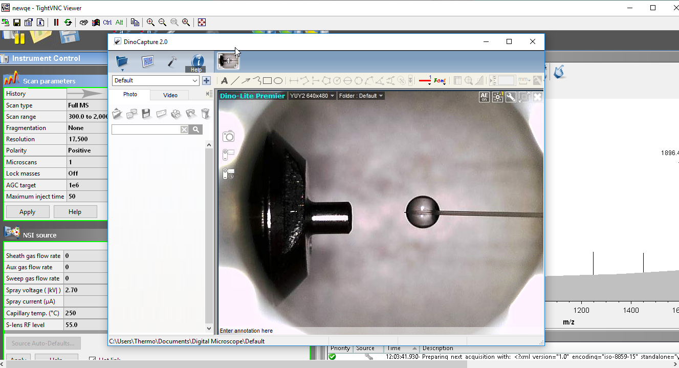 Q-Exactive 와 Orbitrap series 구매시 함께오는 카메라와 스크린은 컬럼의 Spray 상태를 확인할 때 아주 유용합니다.하지만 최근에 스크린 연결없이 바로 컴퓨터에 프로그램을 설치하여 컴퓨터 모니터를 통해 바로 볼수 있습니다.