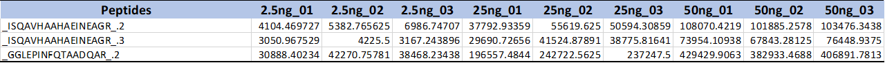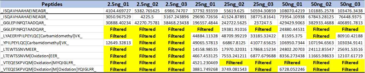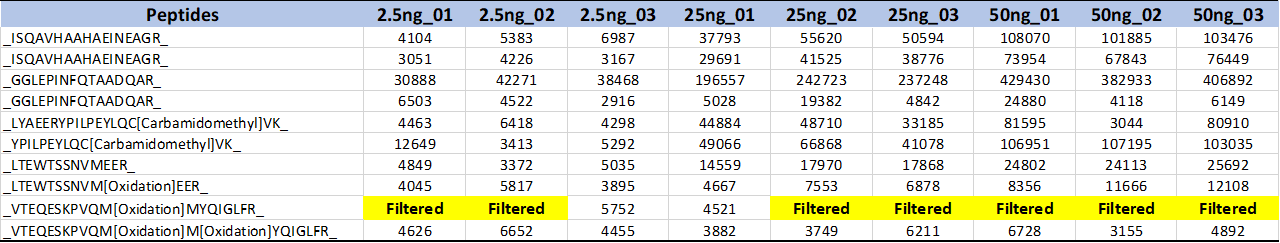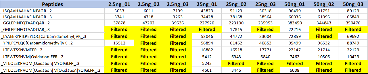 검출된 Ovalbumin의 펩타이드의 정량값은 아래와 같습니다. 많은 펩타이드들이 Filtered 되었습니다. 검출이 안된것일수도 있고 Quality가 좋지 않아서 정량값에서 제외된것일 수도 있습니다. 단백질의 정량분석시 펩타이드중에 Filtered값이 많이 포함된다면 아마 정량성이 떨어질것 같습니다.