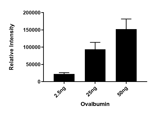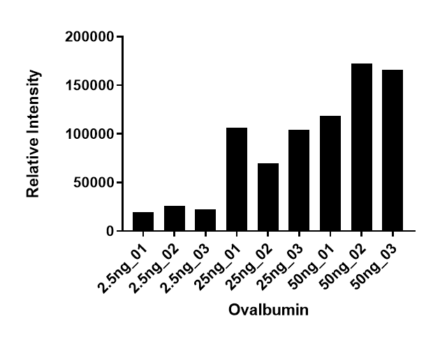 Spectroanut로 분석시 default 값을 사용하였습니다. 각각의 Ovalbumin의 농도에서 검출된 정량분석값은 아래와 같습니다. 전반적으로 이론적인 값과 유사하지만 25ng과 50ng에서 재현성이 약간 떨어지는것 같습니다.