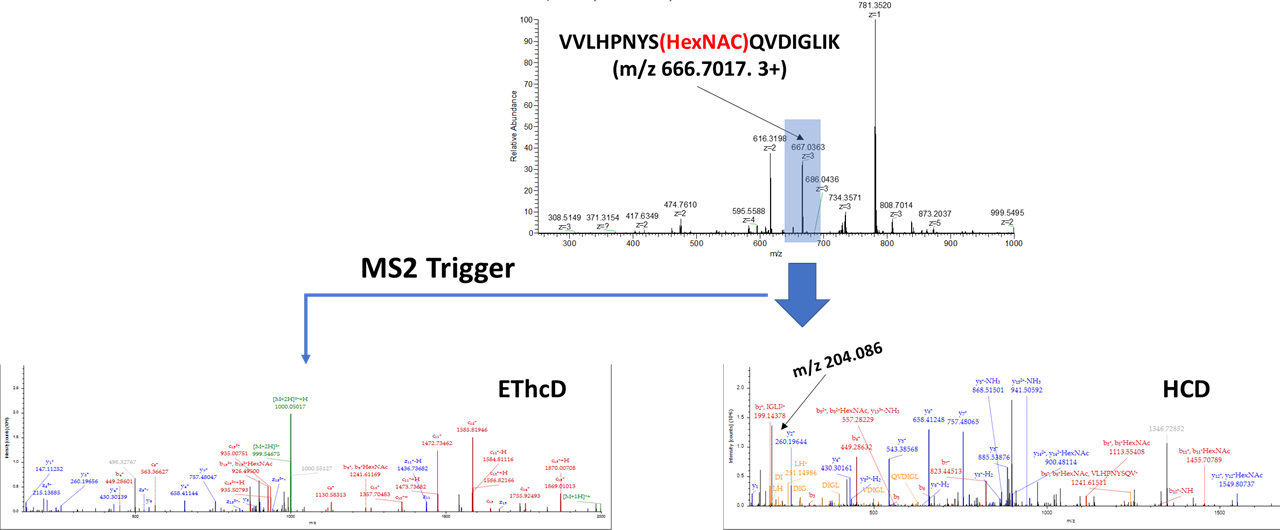 Oribtrap Fusion에서 Targeted Mass Trigger 옵션을 이용합니다. 즉 HCD fragmentation에서 oxonium ions인 m/z 204.086이 나타나면 해당되는 Precursor ion을 EThcD로 한번더 fragment 시킵니다. 즉 동일한 precursor ion에 대해 2가지의 MS2 spectrum이 생성됩니다. 두개의 서로 다른 fragmentation 스펙트럼은 O-linked glycopeptides를 검출하는데 도움이 됩니다.