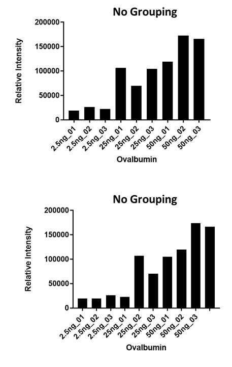 앞에 글에서 수행했던 데이타를 이용하여 Grouping을 하지 않았을때와 했을때 정량값에 대한 차이가 있는지 확인해 보았습니다. 아래와 같이 동일한 양의 HeLa에 서로 다른 양의 ovalbumin 을 spiking 한 시료를 반복 주입한 데이타 입니다.