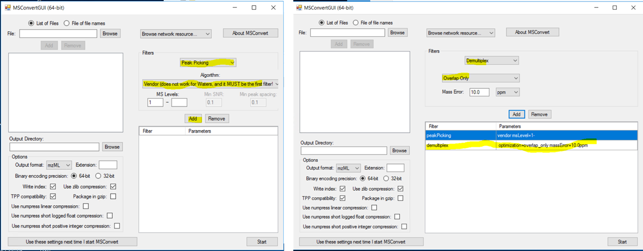 Filters에서 Peak Picking 과 Demultiplex 순으로 옵션을 선택하여 Add를 누릅니다. 최종적으로 아래 오른쪽에 보이는 화면에 나오는것과 같이 셋팅을 합니다.