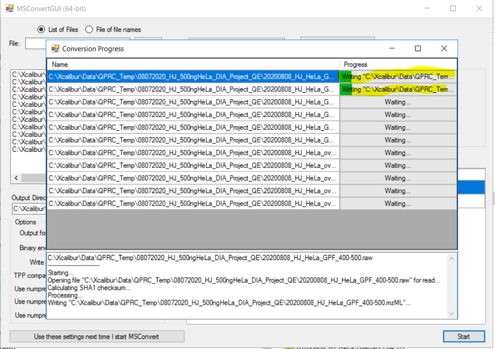 DIA로 분석한 모든 파일을 넣고 한꺼번에 모두 mzML로 변환합니다. 아래는 진행되고 있는 화면입니다.