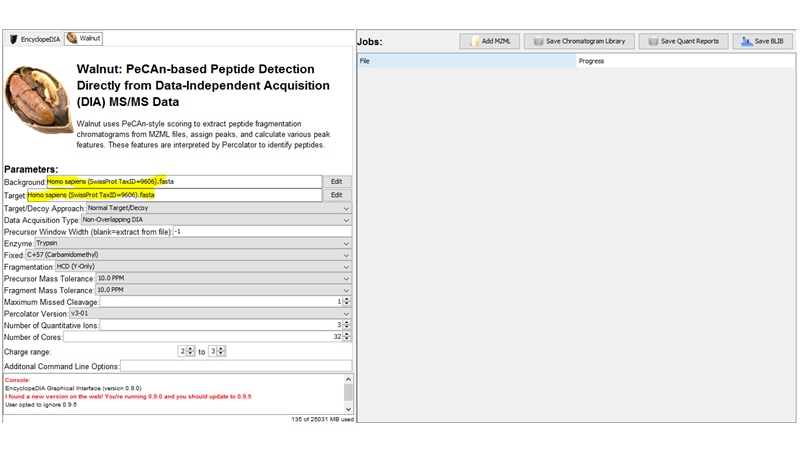 EncyclopeDIA 아이콘을 클릭합니다. 화면에서 두개의 Tab 이 보입니다(EncyclopeDIA & Walnut) . Walnut은 spectra library 를 생성하며 EncyclopDIA 로 생성된 spectra library를 이용하여 실제 DIA 정량분석을 합니다.
