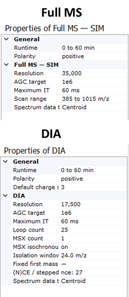 DIA 정량분석을 위한 Q-Exactive의 파라미터입니다. 여기서의 파마미터는 Q-Exactive 에 최적화 된것이며 QE-HF나 QE-HFX 경우 달라질수 있습니다. 24 m/z isolatin 을 사용하였습니다.