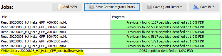 이제 Spectra library로 변환을 해야 합니다. "Save Chromatogram Library"을 클릭하여 저장할 폴더와 파일이름을 씁니다. "Save"를 누르면 바로 진행이 됩니다. 즉 6개의 파일에서 얻어진 스펙트라를 이용하여 한개의 Spectra library를 생성합니다.