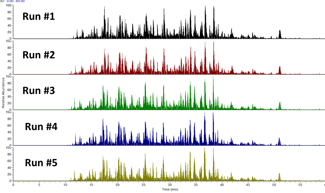 아래는 정량분석을 위해 500ng HeLa standard digest을 5번 반복 분석한 크로마토그램입니다.