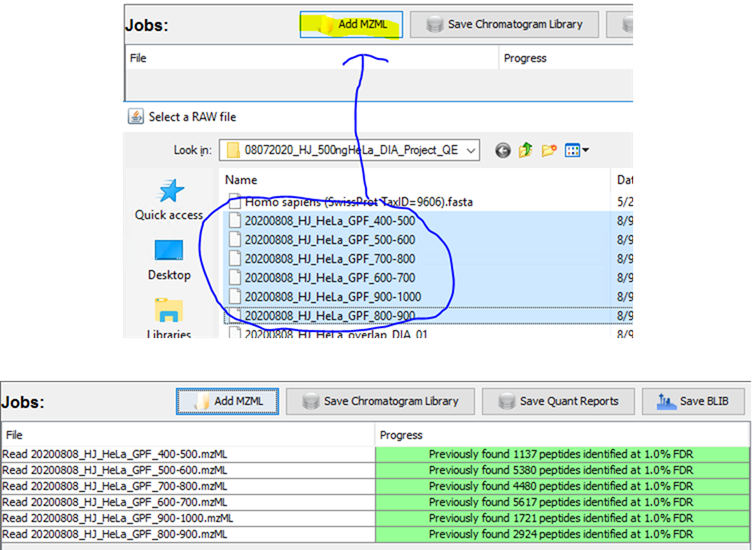 프로그램을 닫고 다시 오픈합니다. (메뉴얼에 프로그램을 닫고 다시 오픈하라고 적혀있습니다. 이제 EncyclopeDIA 탭으로 이동합니다. Library에 조금전 Walnut에서 생성한 library 파일을 업로드 합니다. background 에는 조금전 사용했던 fasta 파일을 업로드 합니다. "Add MZML"을 클릭하여 정량분석하고자 하는 DIA 파일에 해당하는 mzML파일을 모두 클릭합니다. 업로드와 동시에 바로 진행이 됩니다.