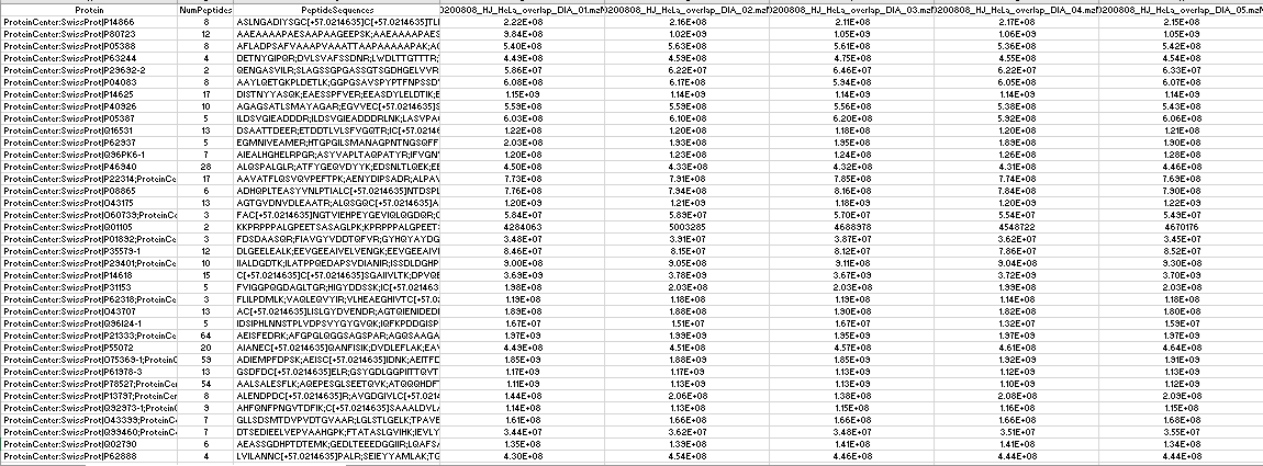 단백질 이름, 검출된 펩타이드수, 펩타이드 종류, 그리고 각 시료별 단백질의 정량값이 보입니다. 펩타이드 그룹도 마찬가로 보입니다.