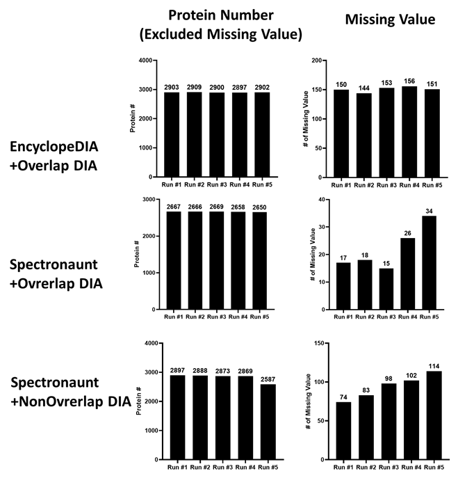 미비한 차이지만 단백질 수로 본다면 Overlap DIA+ EncyclopeDIA 분석법이 가장 많이 나왔습니다. Overlap DIA와 두 프로그램을 비교해본다면 Spectronaunt보다 EncyclopeDIA에서 단백질이 조금더 더 많이 검출되었습니다. 하지만 missing value는 Spectronanut가 더 적었습니다.