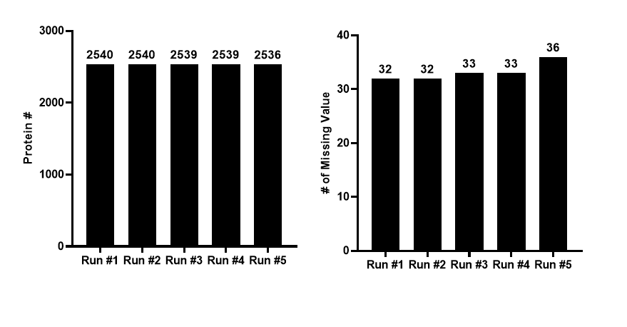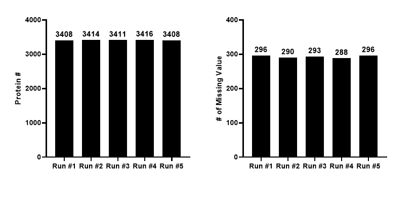 DIA 분석에서의 비교분석한 결과는 아래의 그래프와 같습니다. Missing value 가 존재하는 단백질을 제외한 단백질의 수입니다. 전반적으로 유사한 단백질 수가 검출되었고 또한 높은 재현성을 보였습니다.