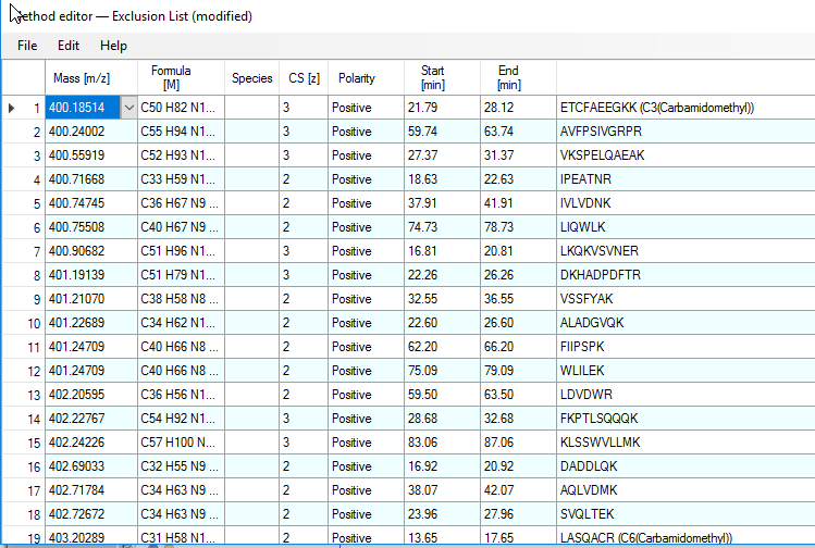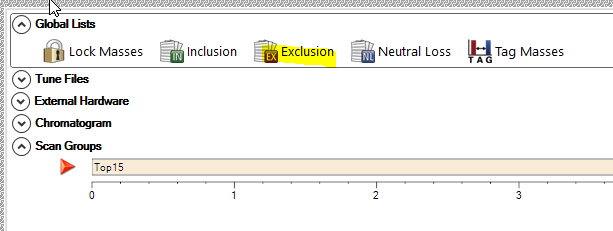 동일한 시료를 Data Dependent Acquisition mode로 여러분 분석시 처음에 검출된 펩타이드는 다음 분석에서 검출이 안되도록 설정하며 새로운 펩타이드가 검출된 가능성을 높일수 있습니다. 이때 사용하는것이 Exclusion mode입니다. 간단하게 앞에서 검출된 펩타이드의 m/z값과 retention time를 삽입하면 됩니다. C의 재현성에 따라 retention time window는 좌우 각각 1분 혹은 그 이상으로 설정하면 됩니다. 이것은 iontrap에서는 효과가 별로 없고 high resolution이 가능한 장비에서 유용합니다. 주어진 시간에서 m/z 값이 10 ppm(변경가능)이내에서 일치하는것만 exclusion 시키도록 설정합니다.