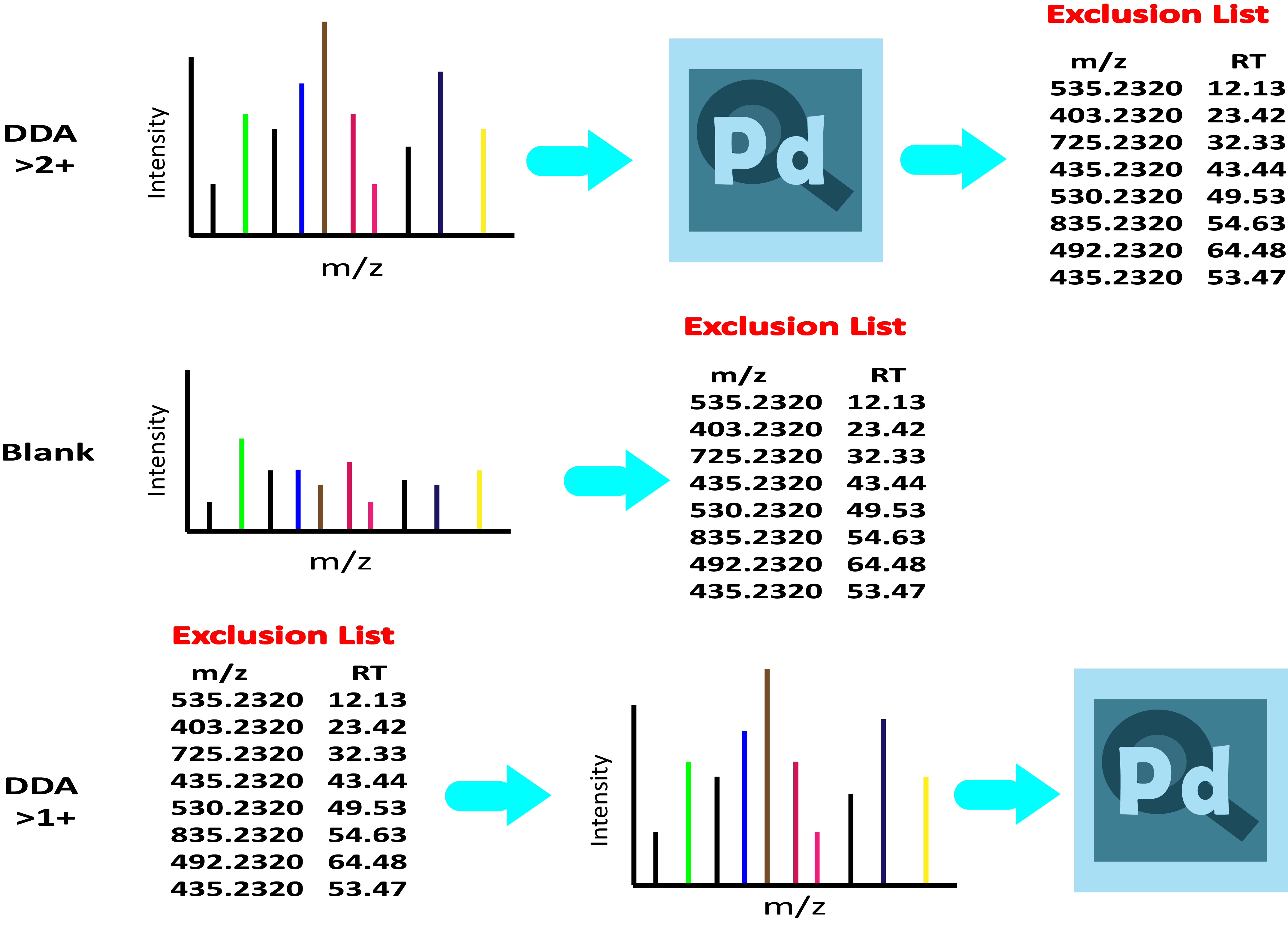 - Database 검색을 통해 검출된 펩타이드의 RT, m/z를 이용하여 exclusion list를 만듭니다. (Proteome Discoverer에서 Exclusion list를 만든는 방법)