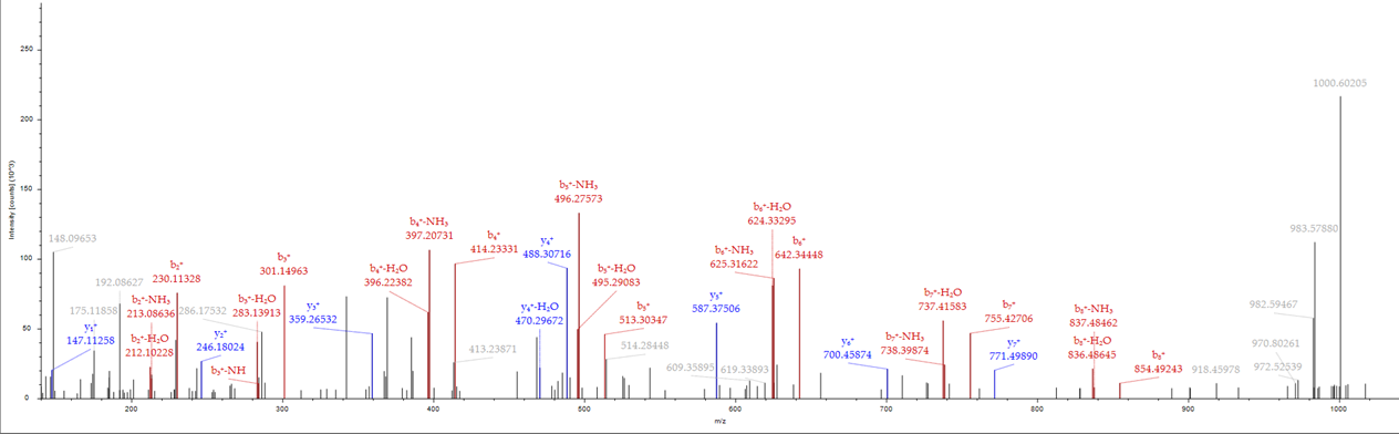 이 방법을 이용하여 분석의뢰자의 시료에서 검출된 Single charge 펩타이드의 스펙트럼입니다 (아래)
