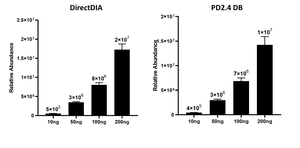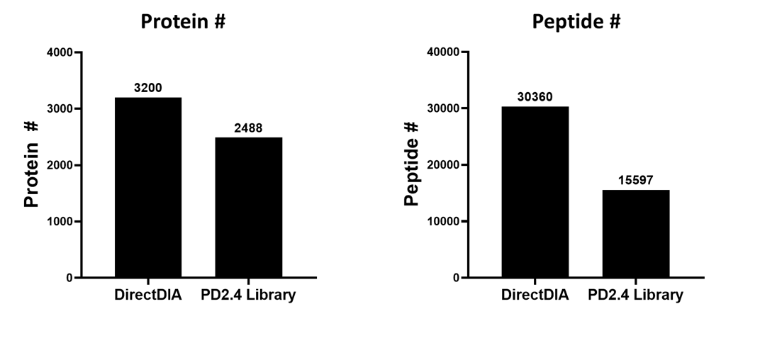 이전 글에서 나온 결과와 동일하게 directDIA에서 보다 많은 수의 단백질과 펩타이드가 검출되었습니다.