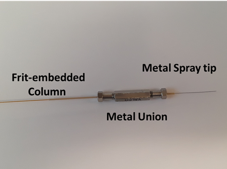 대부분의 실험실에서 Laser puller 나 혹은 다른 방법등으로 Spray tip를 만들어 사용합니다. 즉 컬럼과 spray tip이 결합된 일체형을 사용합니다. 오래전 trap-column 혹은 analytical column을 만들때 Frit를 만들어 C18충진물을 고정시켰습니다. 이때 자주 사용한것이 sol-gel frit 입니다. 대표적인 방법으로 potassium silicate와 formamide 을 일정비율로 혼합한 용액에 Tubing 끝을 살짝 담구어서 고온에 장시간 두면 sol-gel이 형성되어 Frit이 됩니다