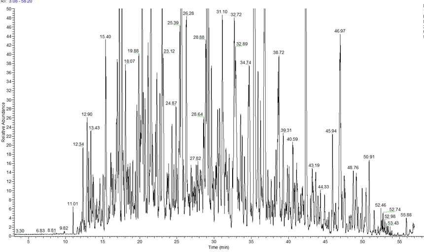 이 컬럼을 Dionex UPLC 이 연결된 Q-Exactive HFX 에 장착하여 테스트 해보았습니다.. 아래는 200 ng HeLa digest를 분석한 크로마토 그램입니다.