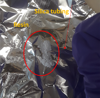 - 절단한 Fused Silica tubing의 단면을 Linchrosorb Si60 파우더에 가볍게 치면서 충전을 시킵니다. 약 30번정도 수행합니다.