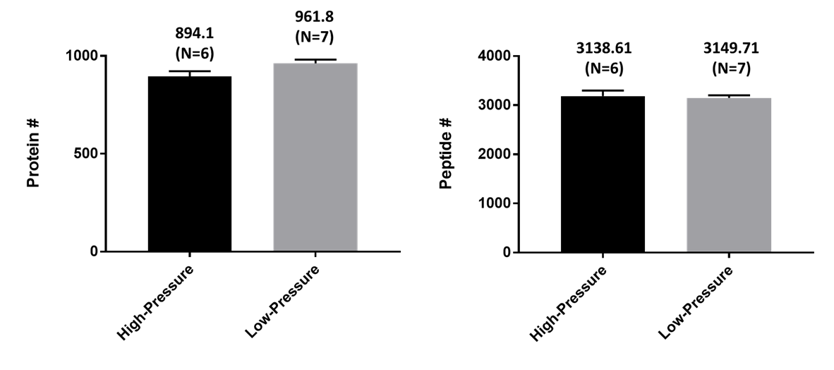 기존 metal fitting 연결된 환경과 PEEK Fingertight Fittings 연결 환경에서 분석한 단백질 과 펩타이드의 수입니다.