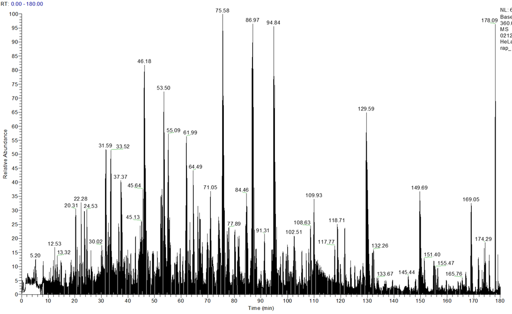 아래는 3시간의 gradient 에서 얻어진 크로마토 그램입니다.