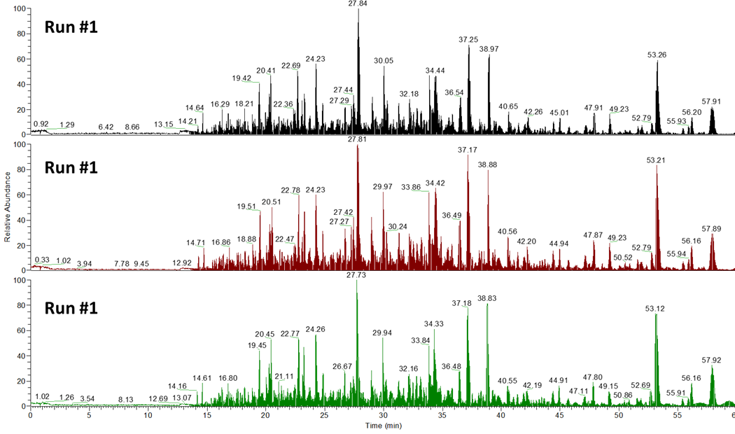 아래는 HeLa digest를 60 min gradient를 이용하여 3번 반복한 크로마토 그램입니다. 나쁘지 않은 피크모양과 함께 아주 좋은 재현성을 보였습니다.