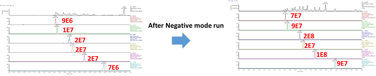 아래 크로마토그램은 감도가 떨어진 상태에서 negative mode 이후 감도가 향상된 예를 보여줍니다.