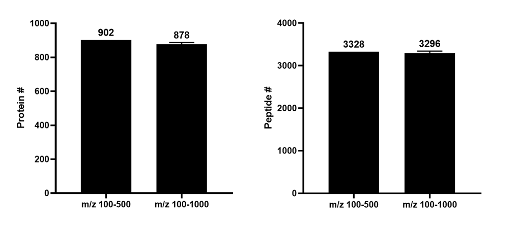 SPS MS3 분석에 있어서 Reporter ion을 검출하는 MS3는 정성보다는 정량분석에 초점이 맞춰서 있습니다. 실제 펩타이드 동정은 iontrap MS2에서 이루어지며 MS3의 경우 Reporter ion이 최대한 높은 감도로 검출될수 있도록 아주 높은 HCD collision energy 를 사용합니다. 그래서 굳이 scan range를 넓게 할 필요가 없이 reporter ion이 검출되는 영역만 scan 합니다. 기존의 논문에서는 m/z 100-1000 를 사용하였습니다. 간단히 m/z 100-1000 와 m/z 100-500 두 영역에서 비교를 해보았습니다.