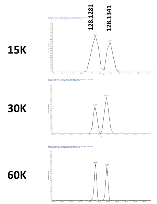 10-plex TMT로 labeling된 시료를 이용하여 확인해보았습니다. 아래는 10-plex로 labeling 된 시료중에 128.1281과 128.1341에 대해 15K, 30K, 60K에서의 분리능을 보여줍니다.