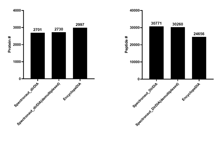 먼저 overlapp 방식으로 얻어진 DIA 파일의 경우 demultiplexing 변환여부에 관계없이 direct DIA에서 큰 차이없는 결과를 보여줍니다. 하지만 EncycopeDIA과 direct DIA 비교에서는 단백질에서는 EncyclopeDIA가 펩타이드에서는 Spectronaut 에서 약간 많은 수가 검출되었습니다.