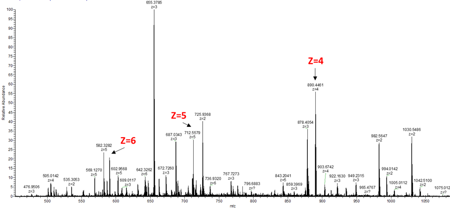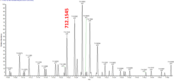 이 중 z=5의 피크를 확대하면 아래와 같습니다. Monoisotope peak 값이 이론적인 값과 수 ppm 이내에서 일치합니다.