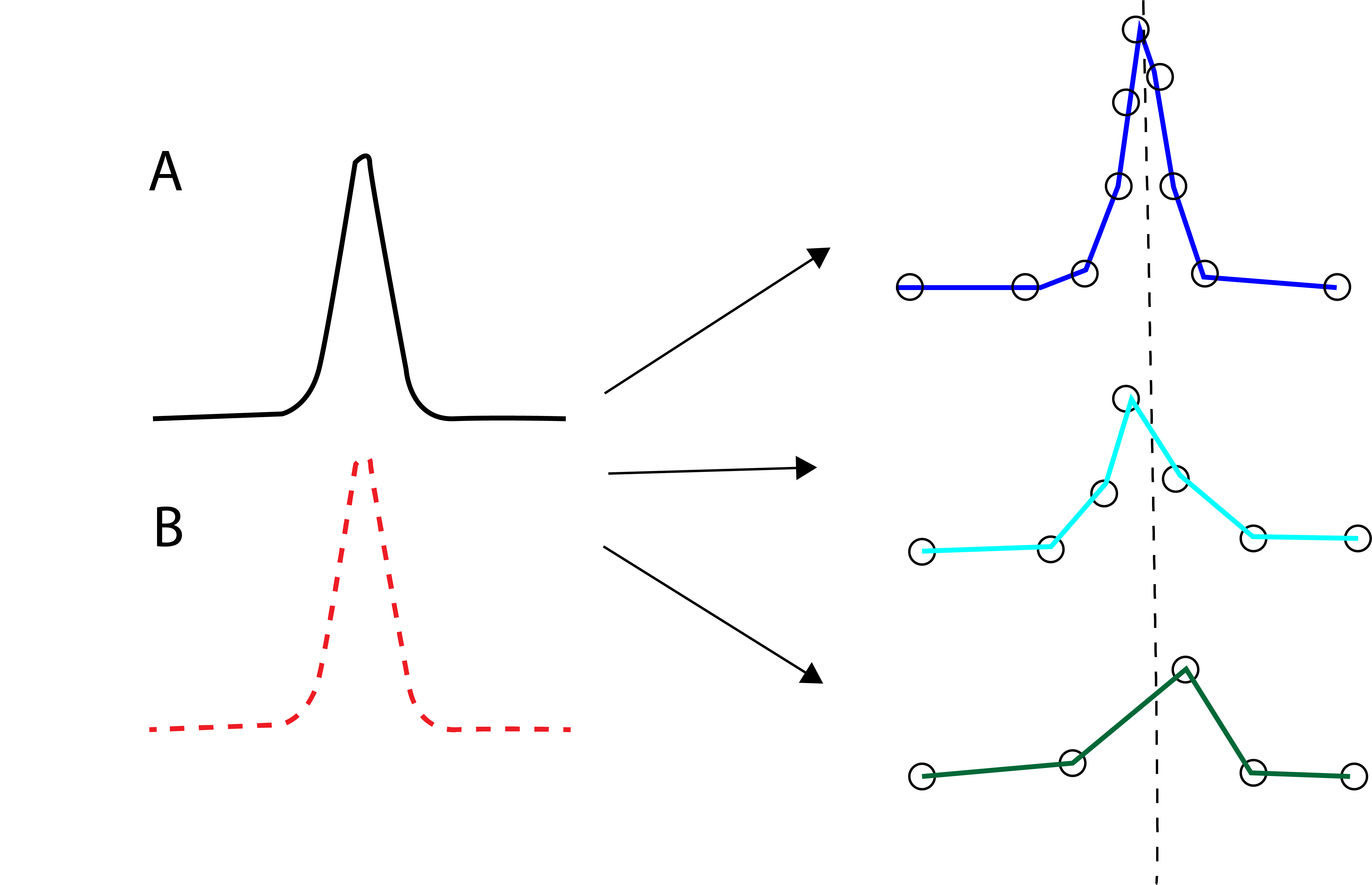 또 하나 중요한 요소는 LC의 크로마토그램의 피크 모양입니다. 동일한 질량분석기의 속도와 감도를 사용할때 LC 피크의 모양에 에 따라서 포인트의 수가 달라집니다. 아래 그림에서와 같이 피크의 모양이 더 좁을 수록 포인트의 수가 줄어듭니다.