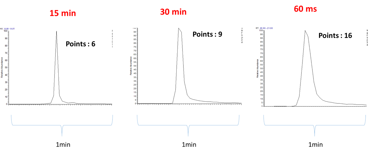 이번에는 모든 조건이 동일할때 peak의 넓이에 따른 point의 수를 비교해보았습니다. 이를 위해서 동일한 조건에서 서로 다른 LC gradient (15, 30, 60min)를 사용하였습니다. LC gradient가 증가함에 따라 피크가 넓어지는 효과가 있기 때문입니다. 아래는 LC gradient에 따른 peak point수를 보여줍니다. LC gradient의 시간이 증가함에 따라 peak의 넓이가 넓어지는것을 볼수 있고 이로 인해 peak point 수는 증가되는것을 볼수 있습니다.
