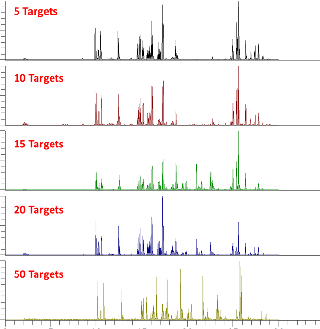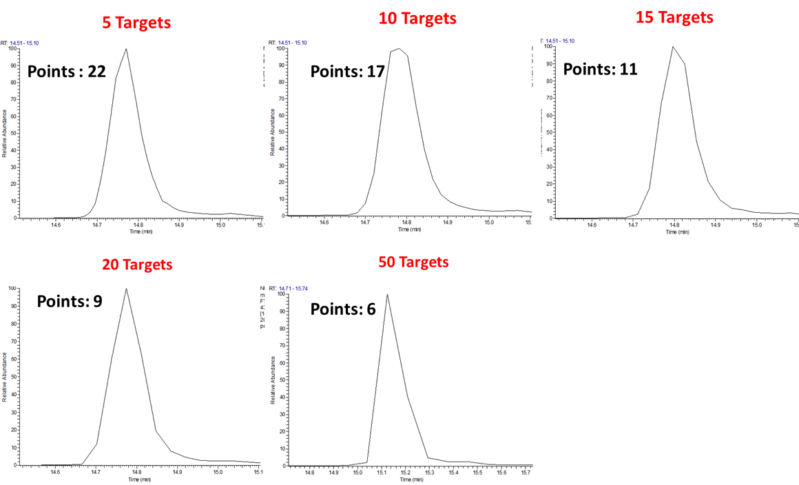 동일한 PRM 조건에서 target 펩타이드의 수를 변화시켜 측정해보았습니다. 동일한 질량분석기의 파라미터를 가진다면 target 펩타이드의 수가 많아 질수록 한 cycle를 왕복하는데 시간이 더 많이 걸리게 됩니다. 아래 크로마토그램은 동일한 PRM 조건에서 각각 5, 10, 15, 20, 50 개의 BSA target 펩타이드를 분석한것입니다.