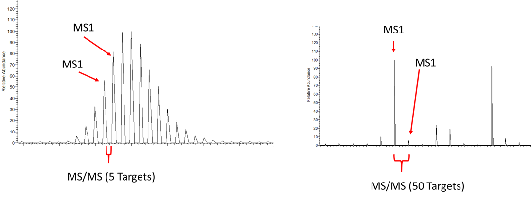 5 펩타이드 분석의 경우 Full MS 후 5번의 MS/MS를 수행한후 다시 Full MS를 진행합니다. 반면에 50개의 펩타이드의 경우 한개의 Full MS 수행후 50번의 MS/MS를 수행하도록 설정하였기 때문에 훨씬 덜 촘촘하게 보입니다. 왜나하면 MS/MS의 TIC는 상대적으로 Full MS의 TIC에 비해서 훨씬 낮기 때문입니다.